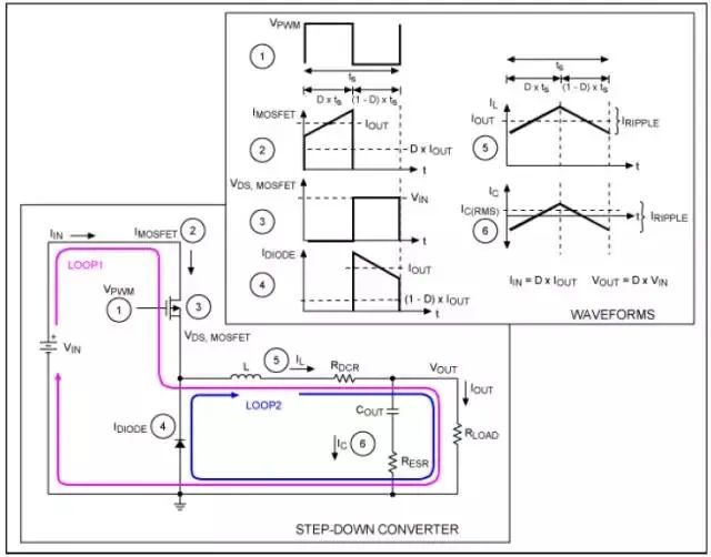 降压转换器的主要功能是把一个较高的直流输入电压转换成较低的直流输出电压。为了达到这个要求,MOSFET 以固定频率(fS),在脉宽调制信号(PWM)的控制下进行开、关操作。当MOSFET 导通时,输入电压给电感和电容(L 和COUT)充电,通过它们把能量传递给负载。在此期间,电感电流线性上升,电流回路如图2 中的回路1 所示。