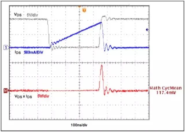 在图5 可以看出,开关变化不是瞬间完成的,电流和电压波形交叠部分导致功率损耗。MOSFET“导通”时(图2),流过电感的电流IDS 线性上升,与导通边沿相比,断开时的开关损耗更大。