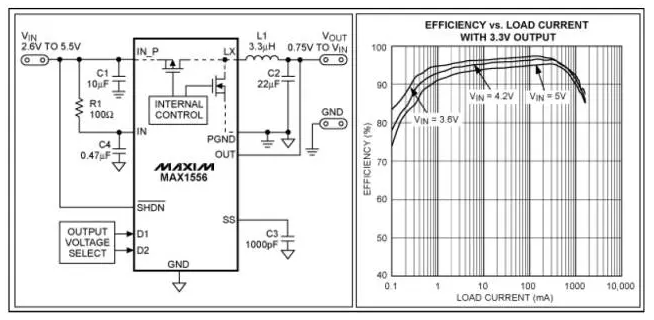 图1. 降压转换器集成了低导通电阻的MOSFET,采用同步整流,效率曲线如图所示