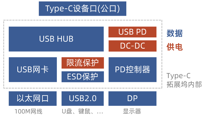 为实现视频信号输出、网络连接、外接移动硬盘、U盘、键鼠和快速充电功能,Type-C扩展坞需要集成USB PD协议芯片、HUB芯片和USB网卡芯片;从设备安全性考虑,还需要集成USB限流保护和ESD静电防护。精简的拓展坞系统组成如下图所示。