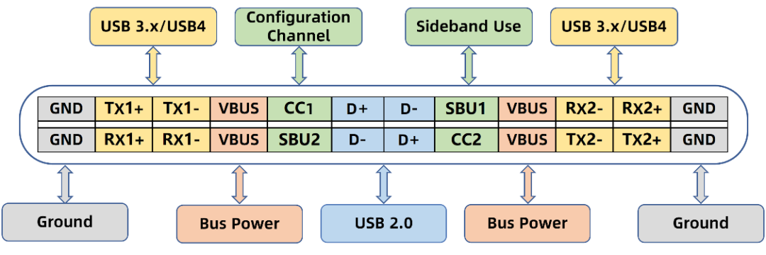 典型Type-C接口包括4对超速差分线、2对D+/D-、1对SBU、2条CC线、4条VBUS和4条地线。USB 3.x/USB4有多个规范,下文统一表述为USB 3.x/USB4。USB 3.x/USB4通过超速差分线传输,USB 2.0通过D+/D-传输。USB2.0、USB 3.x/USB4在线路上相互独立。完整的Type-C接口定义如下图。