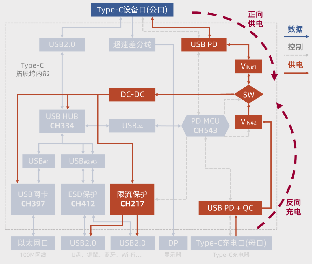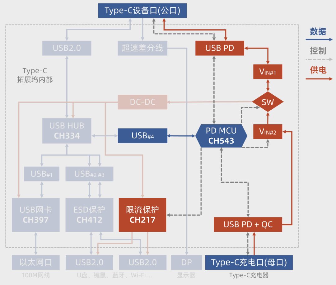 作为控制核心,CH543不但能管理USB PD相关事务、监控输入电压,还可以通过自带的USB主机或设备接口连接至USB HUB,实现Billboard功能;或搭配CH217动态控制电流门限。CH543内置PWM、SPI、UART等常规外设,用户可根据需要拓展自定义功能。