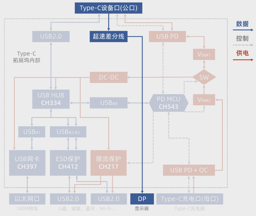 沁恒微电子在USB领域深耕多年,可以提供一站式Type-C拓展坞方案,真正实现USB PD协议芯片、HUB芯片、USB网卡芯片、USB与DP模拟开关、限流保护和ESD静电防护全覆盖。免去繁琐的选型和调试过程,方案专业且成熟,芯片适配性和兼容性有保证。以下是一款经典Type-C方案原理。