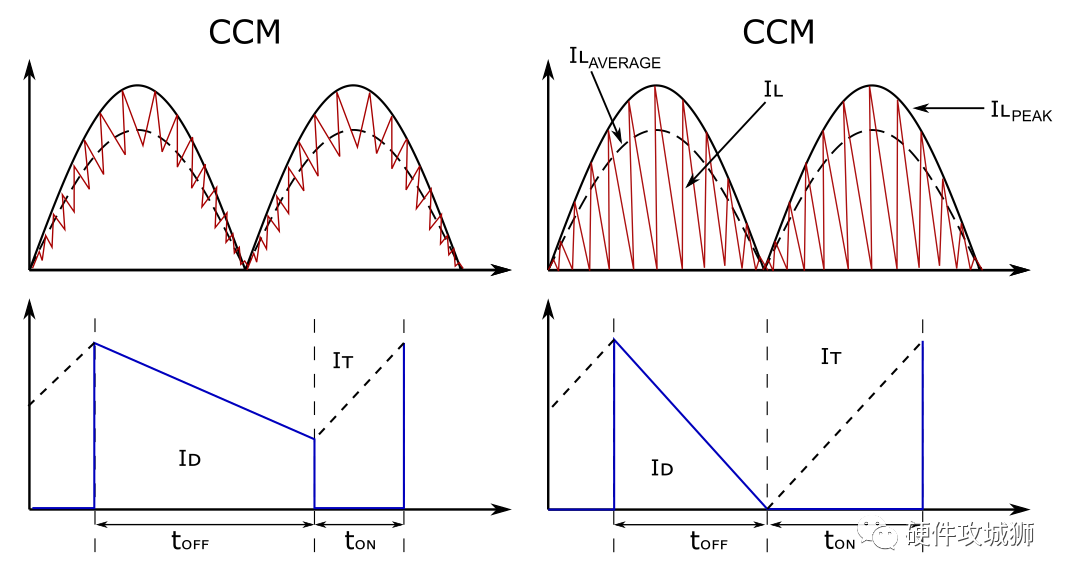 图12: 连续导通模式(左)和边界导通模式(右)下的PFC电感、晶体管和二极管电流