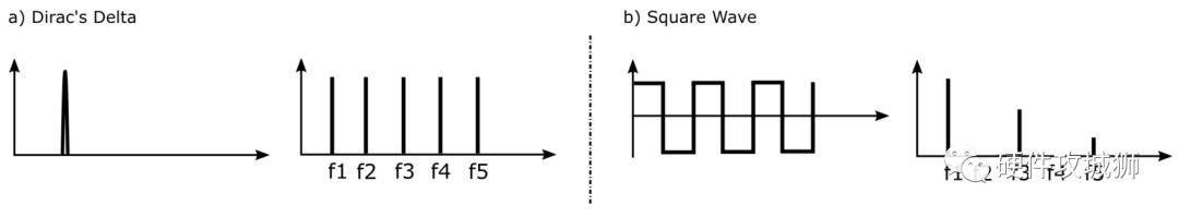 但对电容电流来说,其波形看起来与三角函数非常相似。理想情况下,这种波是无限短、无限强大的脉冲。不难理解,将这种形状的波分解为正弦波会很复杂,而且会产生大量很强的谐波,几乎涵盖所有频率(请参见图5)。