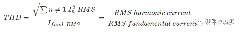 但是,回到我们之间的麻烦,电源设计人员面临的问题不仅是电流和电压波可能异相,还在于电流波形变成了脉冲序列,也就是非线性函数。这意味着电压和电流的乘积(即功率)也是非线性的,而且效率极低。当电路中有非线性负载(例如荧光灯、电子设备和全桥整流器)时,常会发生这种情况。这种负载在极短而且突发的脉冲中吸收电流,这会产生大量谐波并使信号失真。通过总谐波失真的大小(THD)来表示因谐波导致的失真大小是最常见的度量方法。THD代表了谐波电流相对于基波电流的比例,通过公式(2)来计算: