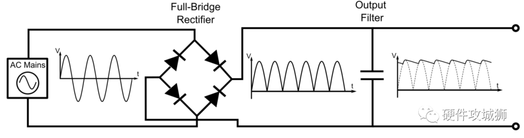 任何一个开关电源的第一步操作都是对输入电压进行整流。整流是将信号从交流电转换为直流电的过程,通过整流器来完成。交流电中的负电压可以通过半波整流器截止,也可以使用全波整流器反相。