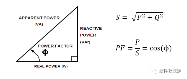 在实际应用中,负载不会是纯电阻性或纯电抗性,而是两者的结合。第三种功率类型是有功功率和无功功率之和,称为视在功率,即S。其和为二次方之和,而有功功率、无功功率和视在功率之间的关系通常表达为三角形。