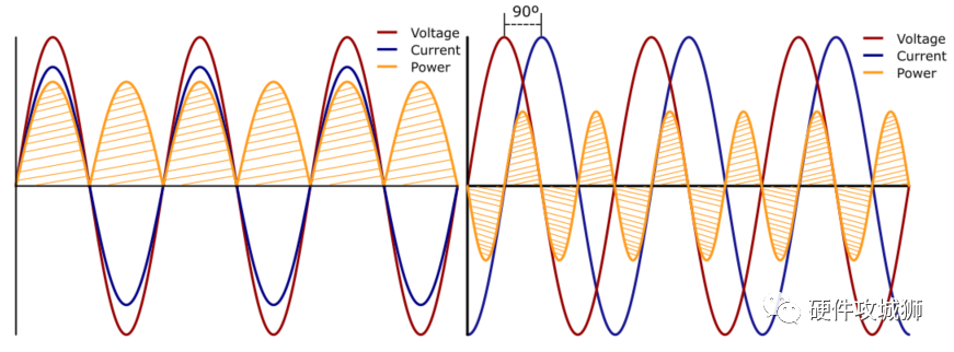 图6:同相V-I波和相关功率(左);90°相位差的V-I波形和相关功率(右)