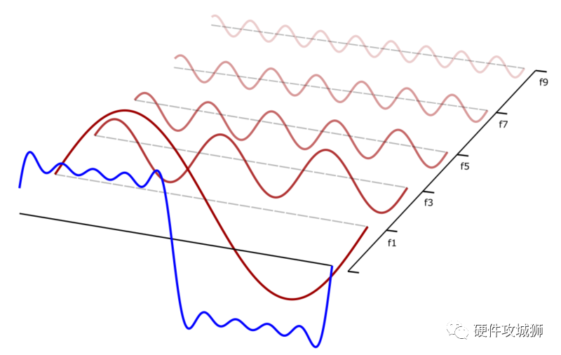 所幸在19世纪,法国数学家Jean-Baptiste Joseph Fourier提出了一种方法,可以将任意一个周期波形分解为一系列具有不同频率的正弦和余弦波,称为谐波(见图4)。其中第一个波为基波,是频率最低的波。其他几个波与基波相结合并给定振幅和频率。根据经验,波形形状偏离纯正弦波越多,其谐波就越多。