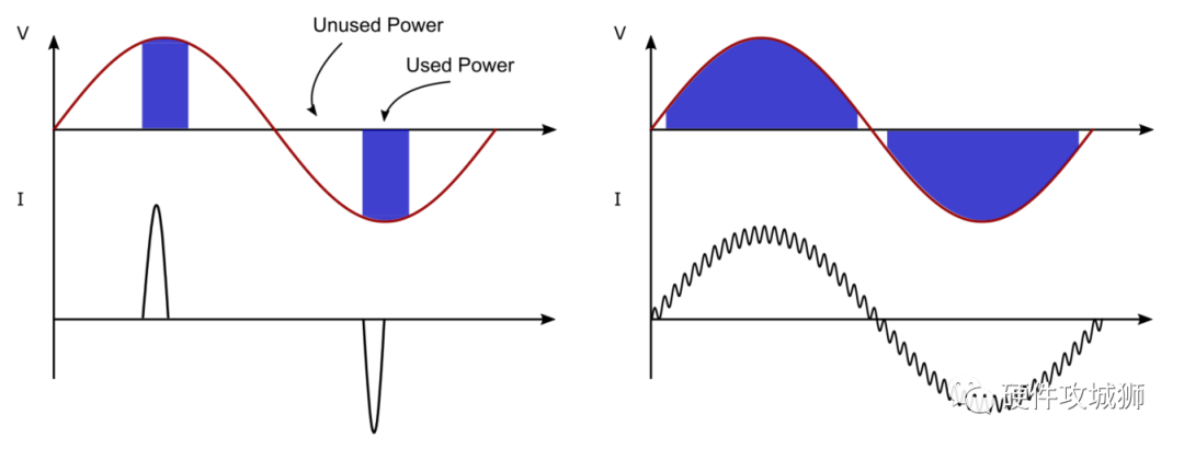 图9:无PFC的低PF功率传输(左)和功率因数校正后的功率传输(右)