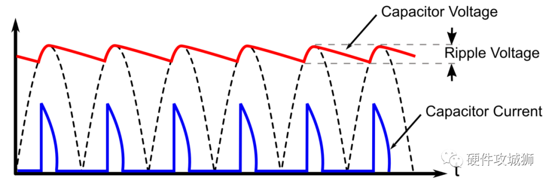但整流器输出波形具有较大的电压变化,称为纹波电压。将一个储能电容器与二极管电桥并联起来,可以帮助平滑输出电压纹波。