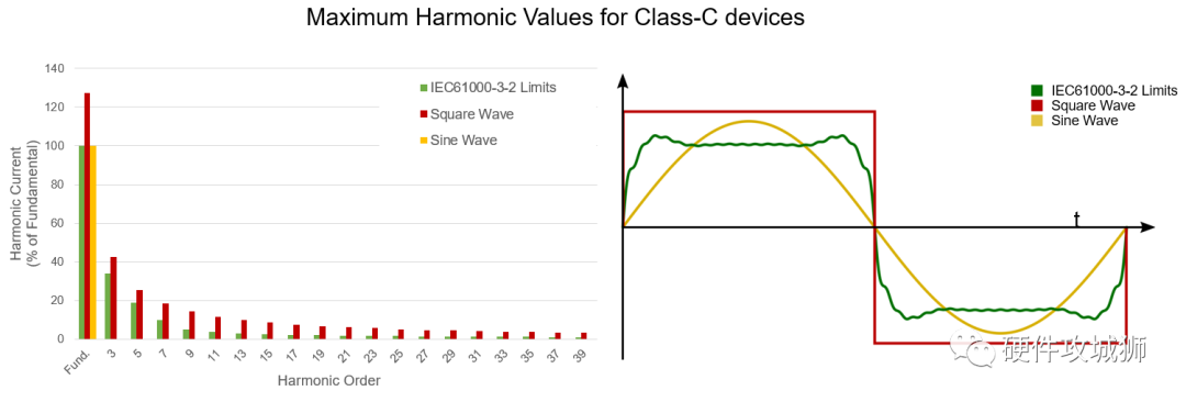 图8显示了IEC61000-3-2对C类设备的波形限制,包括频域和时域。可以看到,频域中的最大谐波幅度值跟随方波,这在时域中观察所得到的波形可以得到确认。