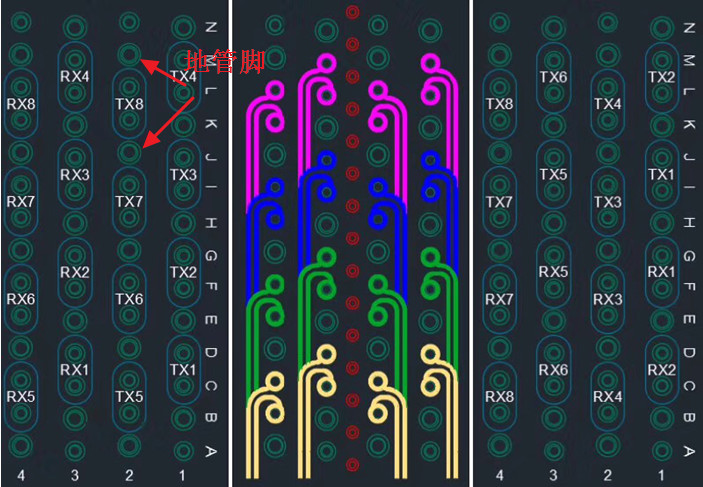 包括一些高速连接器在设计的时候其高速信号管脚两边也是地管脚如下图所示。