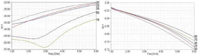 接地过孔与信号过孔的间距从25mil到75mil之间变化时,对信号传输质量影响的仿真结果如下图所示。