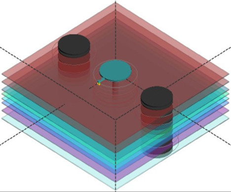 回流地孔不仅能改善信号的EMC和回流通道,还能改善过孔的阻抗,降低链路阻抗的不连续性。高速差分过孔三维电磁仿真的过孔模型,其中就包含了回流地孔,如下图所示。