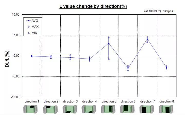 可以看出,标记点朝侧面,感值变化较大,所以贴片时应注意让电感上的标记点朝上。