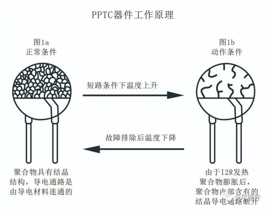 当过大电流产生时,元件急剧产生热量而不能及时散发出去,导致元件内高分子材料温度上升,当温度达到材料结晶熔化温度时,高分子材料急剧膨胀,阻断由导电粒子组成的导电通路,导致电阻值迅速上升,限制了大电流通过,从而起到过流保护的作用。