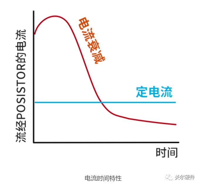 当对POSISTOR施加电压时,起初由于阻值偏低,在加压的瞬间会有较大的电流通过。而随着时间推移,电阻自发热,致使阻值增加,流经的电流因而减小。