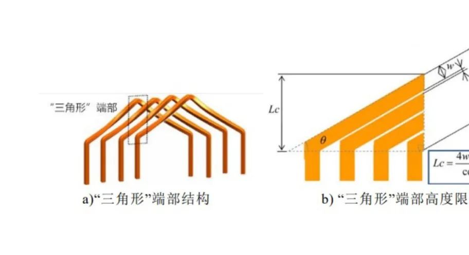 采用发卡电机的绕组在端部高度上也遇到了极限,常规hairpin绕组的端部以三角形的形式呈现,端部高度Lc受到三角形的角度 θ和间隙的限制。