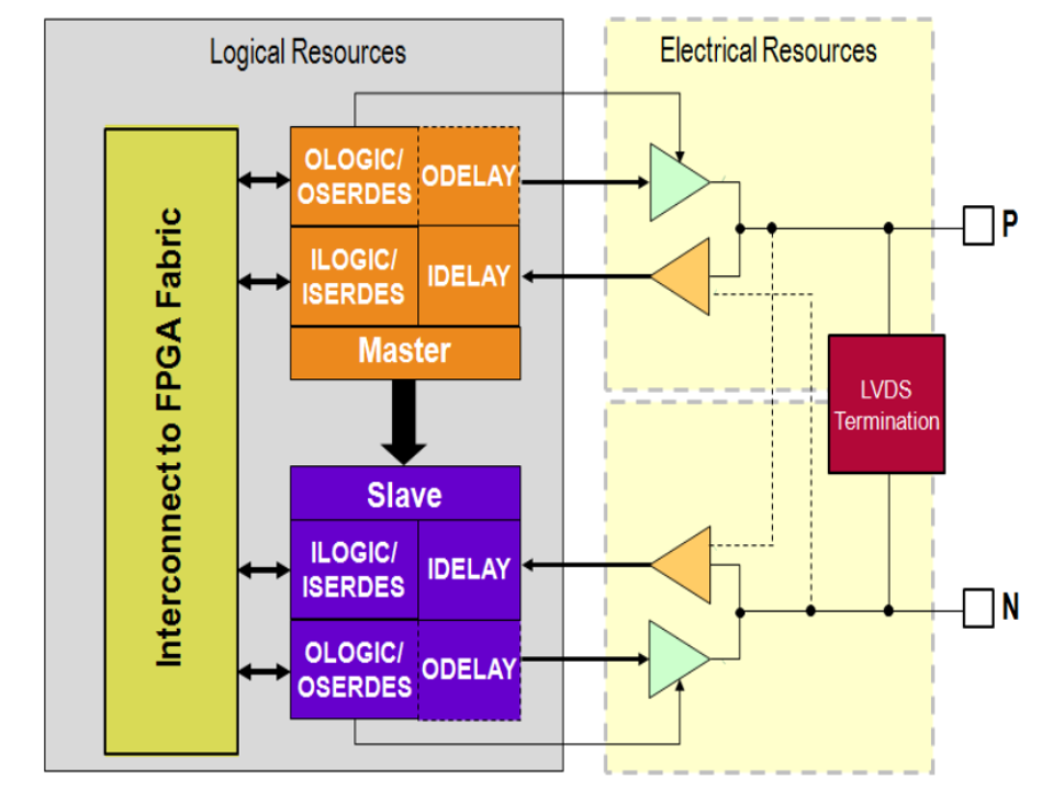 ZYNQ上的通用输入/输出功能(IOB)合起来被称作SelectIO资源,它们被组织成50个IOB一组,每个IOB有一个焊盘,是与外部连接来做单个信号的输入或输出的。每个IOB还包含IOSERDES资源,可以做并行和串行数据的可编程转换