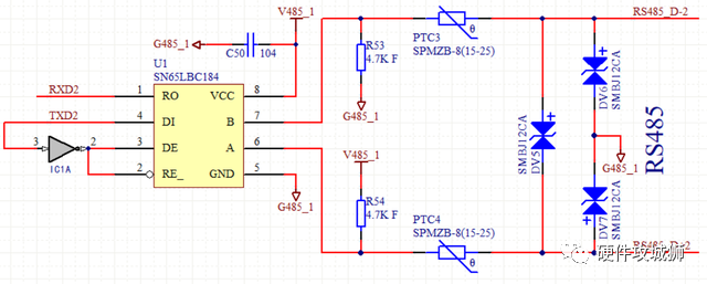 最常用的RS485收发换向方法是程序换向,即由MCU的一个I/O端口控制RS485收发器件的收发使能引脚,在平时使RS485收发器件处于接收状态,如下图,这里485芯片用TI的SN65LBC184,最大速率达到250Kbps,当有数据需要发送时,MCU将RS485收发器件引脚(网络RS485_EN2)置于发送状态,完成数据发送后,再把RS485收发器件切回接收状态。