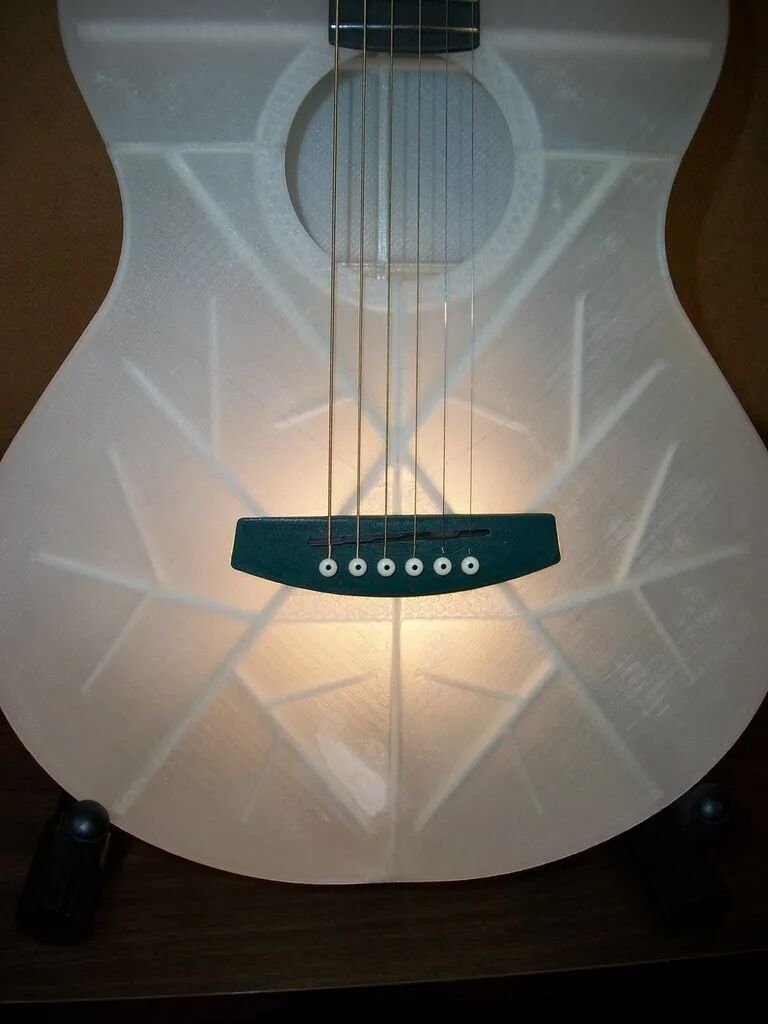 这是我原来的印刷吉他 (ID:710561) 的改进版。 它采用 15% 碳纤维填充 PLA 印刷,比普通 PLA 硬约 50%。 我还在 X 型支撑中添加了用于铝肋的槽,以防止顶部随着时间的推移而翘曲,并添加了一根从头到脚跟的铝制桁架杆,以防止颈部翘曲。
