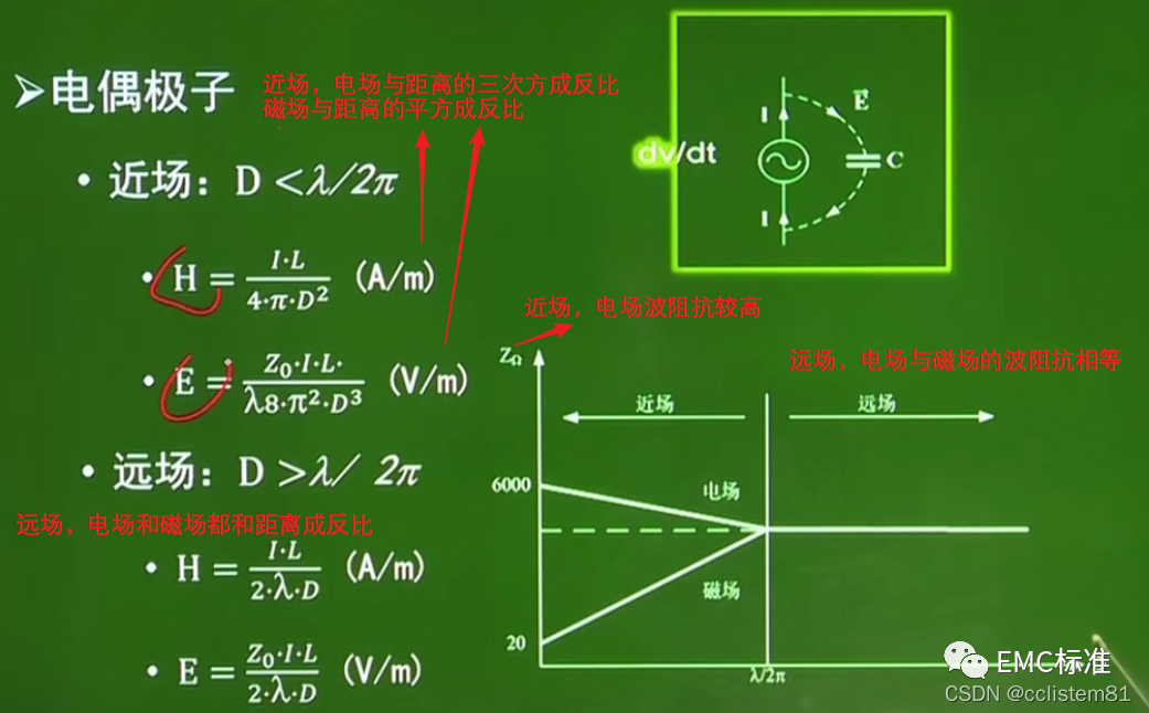 4、无论场源是电场源还是磁场源,当离场源的距离大于λ/2π以后,都变成了远场,又称辐射场。这时电场和磁场方向垂直并且都和传播方向垂直,称为平面波。