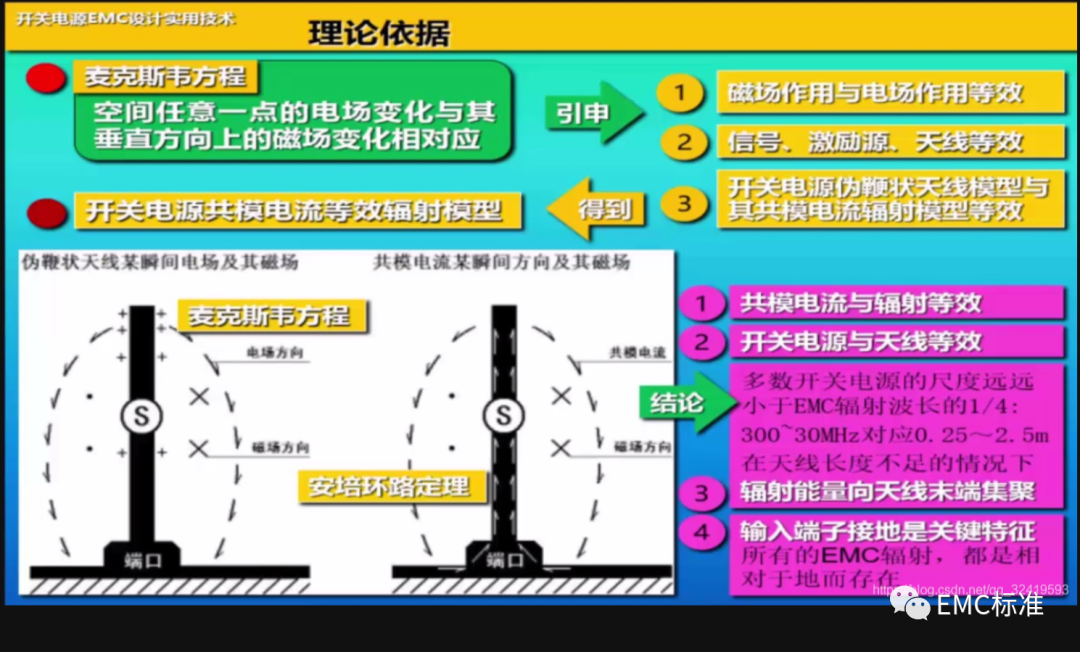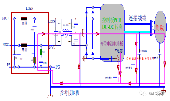 1、上图可看出开关电源输入/输出电缆对地产生的共模电流会产生磁场,即电缆可看成一根天线。