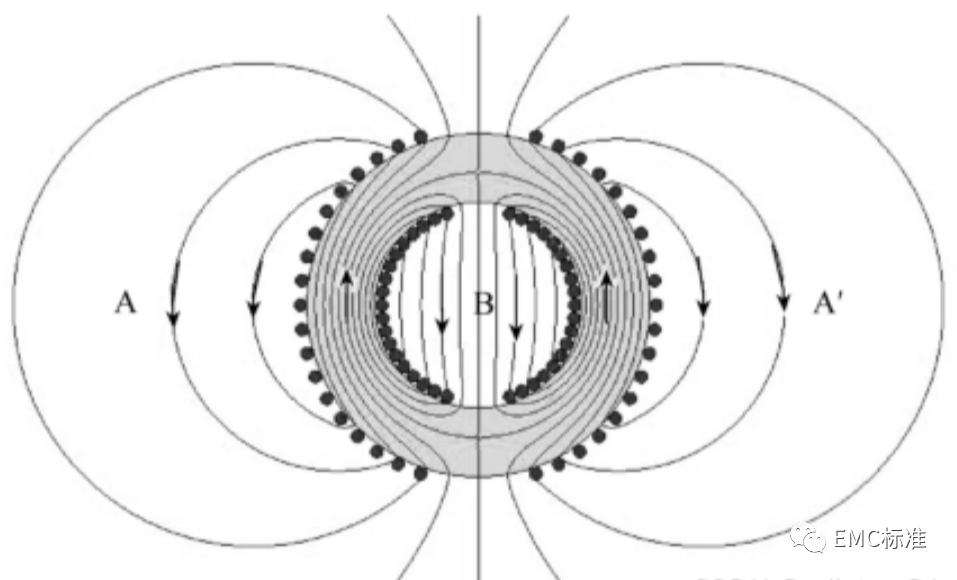 以共模电感为例,其周围的电磁场泄露见下图,可见要避免在其上下两绕组开口处放置敏感器件,此两处漏磁场密度最高,强度最大。