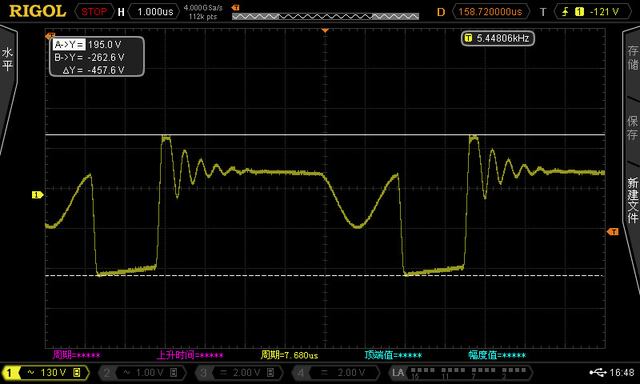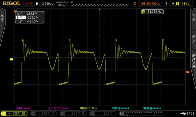 一、RCD钳位电路 反激式开关电源的RCD钳位电路由电阻R1、电容C1和二极管D1组成,如下图,其中:Lk为变压器的漏感,Lp为变压器原边绕组电感、Cds为Q1的寄生电容、T1为变压器、Q1是开关管、D2是输出整流二极管,E1是输出滤波电容。 变压器漏感Lk与原边电感Lp串联,原边电感Lp与变压器T1并联。原边电感Lp的能量可通过理想变压器T1耦合至副边,给后端负载提供能量。但变压器漏感Lk的能量无法耦合至副边,只能通过寄生电容释放能量,引起的尖峰电压,可以通过电阻R1吸收回路吸收能量。 1、工作原理 为了简化,其他的元器件已去掉,工作过程:Vin是整流之后的直流脉动电压,当开关管Q1关断时,漏极电流迅速下降,变压器原边电流给Cds充电,D1导通。由于C1容值远大于Cds,所以Lk释放的能量主要给C1充电。 由于电容电压具有不能突变的特性,且电容值越大电压变化率越小,因此C1的存在,降低了开关管漏源电压尖峰值,减小了开关管电压变化率,电源的EMI也就较好。 当绕组中的电流反向时,D1截止,C1充电结束,此时C1通过R1放电,C1吸收的漏感能量通过R1来消耗。 2、Uds关键波形分析 1)下图是开关管Q1的Vds电压随着时间变化的波形图,t1时刻前也就是纵坐标为零时候,Q1导通,由于变压器原边电感较大,且电感两端电压与电流变化率成正比,因此流经漏感电流线性上升,到t1时刻,Q1断开; 2)t1至t2时刻时,由于变压器原边电感的作用,流经变压器的原边电流基本不变,且此时RCD钳位电路中的二极管关断,输出电路的二极管D2反向截止。 这一阶段可以认为是变压器的原边电流对Q1的寄生电容Cds恒流充电。 而在此时电容C1向R1缓慢放电,当漏极电压大于整流后的输入电压与变压器副边的反馈电压之和后,变压器原边的能量耦合到副边,并经整流二极管D2整流,以及E1电容滤波之后开始向负载提供能量。 3)t2时刻后,ds大于输入电压与C1此时的两端电压之和,二极管D1导通,流经D1的电流急剧上升,同时钳位电容C1不断充电,直至t3时刻变压器原边电流下降为零时,二极管D1再次关断,此时漏极电压升至最大值。 4)t3时刻后由于寄生电容Cds两端电压大于输入电压,将有一反向电压加在变压器原边两端,因此,Cds与变压器原边励磁电感及其漏感开始谐振,谐振期间,开关管的漏极电压逐渐下降,储存于Cds中的能量的一部份将转移到副边,另一部分能量返回输入电源,直到谐振结束,漏极电压稳定至直流输入电压(Vin)与变换器次级反射电压(Vor)之和大小。 为方便理解,对Q1关断时候的尖峰端Uds的波形电压解剖分析,在下图中,Vdsmax=Vinmax+Vor+Vspike,其中: Vds:Q1中D与S两端电压 Vin:直流输入电压 Vor:变压器次级反射电压 Vspike:变压器初级漏感造成的尖峰电压 3、RCD不同电阻下的波形分析 RCD钳位电路当中,选择合适的电阻电容对于能量吸收以及输出效率和芯片发热起着关键的作用,有些开关电源是不需要RCD等其他吸收电路的,具体电路具体分析,去掉之后芯片内置MOS管可能会容易损坏,因此,一般都要增加吸收电路。 如下图是反激式开关电源局部电路,看看改变电阻R1阻值,Uds波形参数会有什么变化,取R1分别等于360K、180K、106K,市电输入190VAC、相同负载情况下测试的波形。 1) R1=360K 从下图可以看出来,在R1=360K时候,Vds=548.6V 2) R1=180K 从下图可以看出来,在R1=180K时候,Vds=481.0V 3) R1=108K 从下图可以看出来,在R1=106K时候,Vds=457.6V 从以上三张图可以看出,电阻越小,Vds电压越小,这是由于放电电流越快,因为C1吸收的能量靠电阻来消耗,但是R1过小会增大变压器能量损耗; 事实上,电容值过大时,电容两端电压上升缓慢,变压器原边的能量不能快速传递到变压器副边;电容值过小,电容上电压很快会降到变压器副边反射电压,在开关管导通之前,箱位电路电阻将成为反激开关电源的死负载,消耗变压器的磁芯能量,降低整个电路效率。 二、总结 电容电阻都需要选择合适,如电压峰值比较大,那么电容的电压应力大,在满足箱位电路功能的作用情况下,可进行电容值的增大电容,从而可以降低电压电压峰值; 同时需要调节箝位电路的电阻值,使得幵关管导通时,电容上电压降为接近变压器副边反射电压,之后电容对电阻继续放电至开关管再次导通。