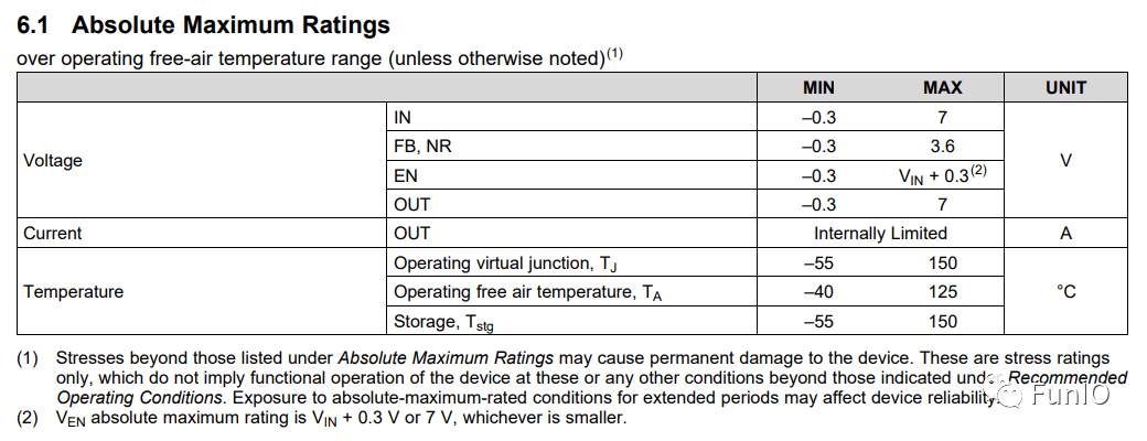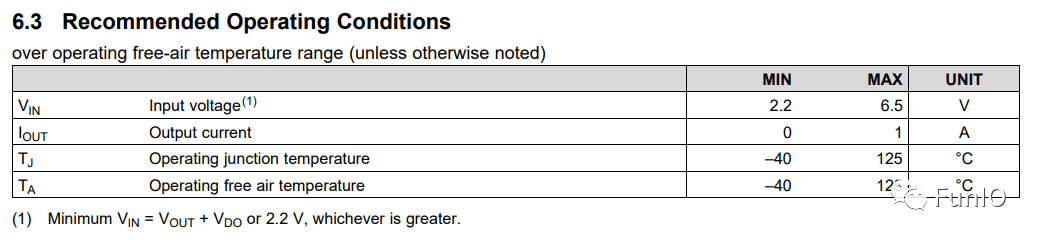 通常说的输入电压是 LDO 正常工作的输入电压范围,而不是 绝对最大电压,可以看到这个 LDO 的输入电压范围是 2.2V – 6.5V。
