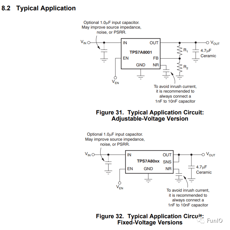 可调输出的版本通过外部反馈电阻,可以将输出电压调整到期望的值。TPS7A8001 是可调输出电压。