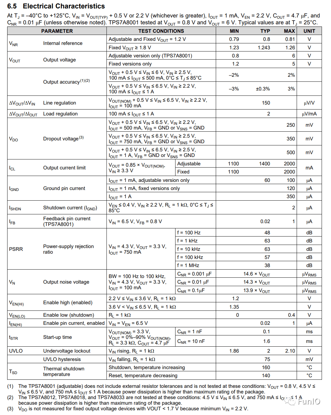 以 TI TPS7A80 系列 LDO 为例,看看这些参数在数据表中的表示。