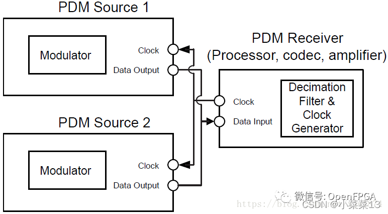 通过PDM接口方式,传输双声道数据只要用到两根信号线。如图21示意两个PDM接口的发送设备与同一个接收设备的连接情况,比如Source 1/2分别作为左右声道的麦克风,通过这种方式可以将采集到的双声道数据传送到接收设备。主设备(此例中作为接收设备)为两个从设备提供时钟,分别在时钟的上升沿和下降沿触发选择Source 1/2作为数据输入。
