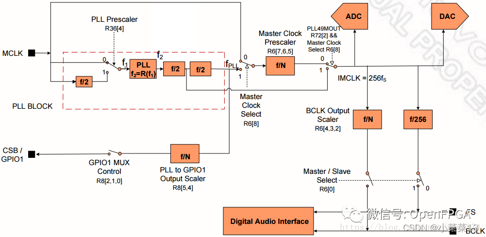 在I2S/PCM接口的ADC/DAC系统中,除了BCLK和FS(LRCLK)外,CODEC经常还需要控制器提供MCLK (Master Clock),这是由CODEC内部基于Delta-Sigma (ΔΣ)的架构设计要求使然。MCLK时钟频率一般为256*FS,具体参考特定器件手册。