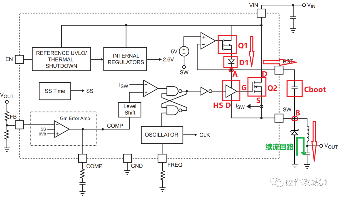 详解DC-DC电路自举电容的工作原理 所谓自举电容,通俗点说就是自己举起自己的电压,它是利用电容两端电压不能突变的特点实现电压升高。 为了方便理解,我们借用MPS的MP2560芯片为例进行分析说明,如下图电容C4就是的自举电容。 图1 DC-DC典型电路图 为了方便分析自举电容的工作原理,我们从MP2560芯片的内部原理框图入手,去了解自举电容到底是如何实现自举的。 图2 DC-DC电路内部原理框图 其中: Q1、D1:PMOS开关管和反向保护二极管; Q2:DC-DC电路的开关管; HS Driver:DC-DC电路的开关管的驱动电路; 现在我们将从两方面分析电容如何实现自举。 1)自举电容充电 DC-DC电路的工作原理及电流回路想必大家都比较清楚了,那么自举电容是如何实现充电的呢。 如图2所示,开关管Q2与自举电容为并联关系,要给自举电容充电就必须使Q2截止,Q2截止后DC-DC电路就利用功率电感和续流二极管给负载供电,其电流回路为绿色电流回路。Q2截止后开始给充电,其充电电流回路为Q1D1功率电感L输出滤波电容C。当功率电感L中的储能放完后,B点电位接近,自举电容电压约等于,至此完成自举电容充电。 2)自举电容升压 自举电容充电完成后,开关管NMOS Q2处于截止状态,其=0V、=0V、=(忽略二极管压降)。 当开关管Q2导通时=,此时NMOS管导通瞬间由。如果没有自举电容,导通后电压由,NMOS管又会重新关闭,电路输出的电压就会异常。如有自举电容就不一样了,当由时,利用电容电压不能突变的原理,使得电压由,此时的电压在NMOS管导通前后保持不变等于,这样就达到自举升压作用了。