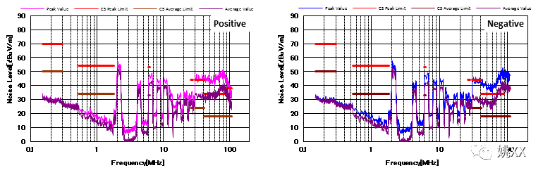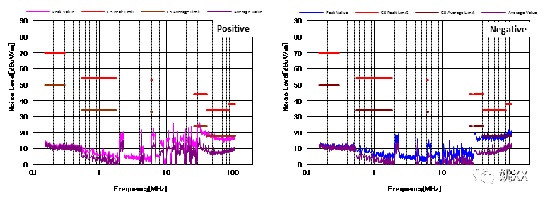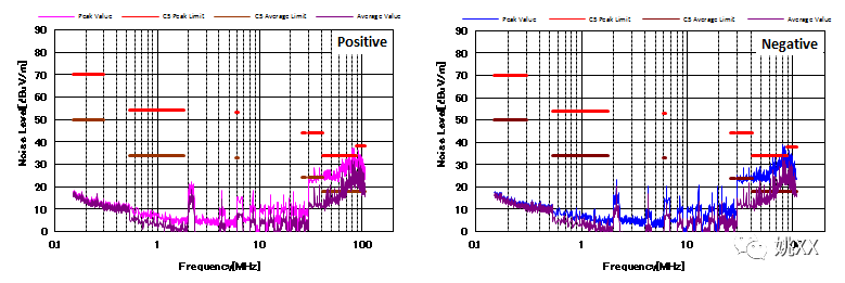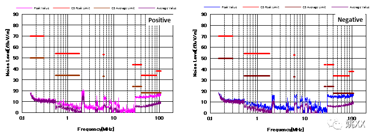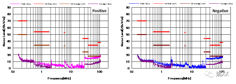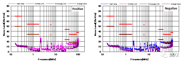 图4显示了增加CM和DM滤波器后的噪声特性。与图3相比,CM滤波器的增加降低了近20dBμV/ m的CM噪声。并且EMI性能也通过了CISPR25 C5标准。