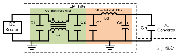 图1是一个简化的EMI滤波器,包括共模(CM)滤波器和差模(DM)滤波器。通常,DM滤波器主要用于滤除小于30MHz的噪声(DM噪声),CM滤波器主要用于滤除30MHz至100MHz的噪声(CM噪声)。但其实这两个滤波器对于整个频段的EMI噪声都有一定的抑制作用。