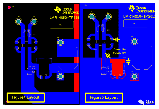 图4和图5之间噪声结果的不同主要是由于PCB布线差异所致,如图6所示。图5的布线中(图6的右侧),大面积覆铜(GND)包围着DM滤波器,并和Vin走线形成了一些寄生电容。这些寄生电容为高频信号旁路滤波器提供了有效的低阻抗路径。因此,为了最大限度地提高滤波器的性能,需要移除滤波器周围所有的覆铜,如图6左侧的布线。