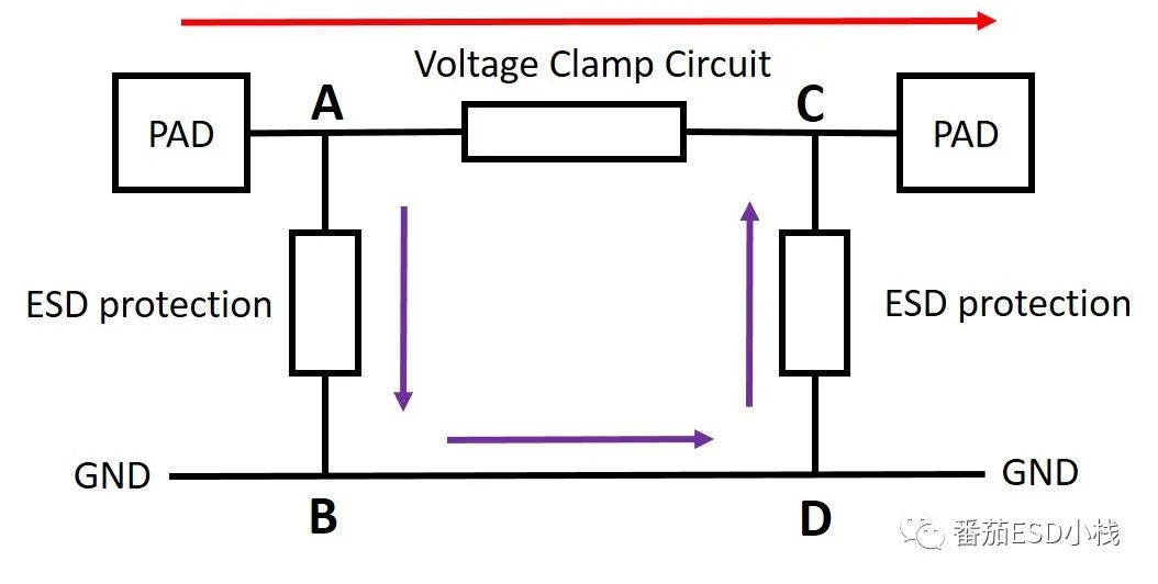 如图四所示,正常情况下ESD电流(紫)流经A→ESD protection →GND→ESD protection→C,钳位电流(红)流经A→Voltage Clamp→C。简单来说,如果AC两点间ESD环路的Trigger Voltage<Vclamp,那么正常工作时ESD电路会被先触发,电路功能错误。反之,如果AC两点间ESD环路的Holding Voltage>Vclamp,ESD静电流优先通过Voltage Clamp Circuit进行泄放,带来失效风险。如果采用Rail Based ESD防护策略(端口二极管+GCNMOS Power Clamp该结构会根据ESD的频率特性进行触发,可以一定程度避免ESD防护电路与钳位电路产生冲突的风险。但是笔者目前所接触到需要设计Voltage Clamp Circuit的场合大都不适用Rail Based ESD防护策略。