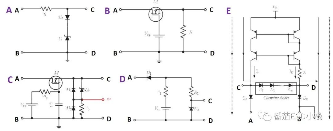 之后又提出了很多的钳位电压结构,如图三所示。其中图三A是将正向二极管串联反向稳压二极管,该结构能降低部分寄生电容,但是钳位电压受工艺影响较大。图三B是将输入结点AB与输出结点CD间跨接一个NMOS,NMOS的栅压始终为高,根据AB电压差的不同,NMOS在饱和区和线性区间切换,以此实现钳位功能,该结构在高低电平转换时的过冲较为明显,所以为了改善这一现象提出了图三.C中的电路结构。图三D是另外一种钳位电路设计思路,通过AB点压差控制二极管的开关,电路开启不同的电流路径,以此实现钳位。图三E是利用电流镜的钳位电路,AB压差控制二极管DA,DB的开关,控制电流沿实线或虚线流动,以此实现钳位。