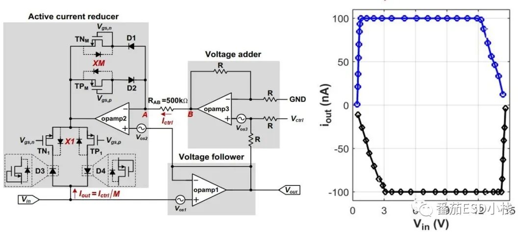 除了电压钳位电路外,还有电流钳位电路,其电路图与IV曲线如图七所示。这类电路通过放大器控制TN1和TP1对Vin电流进行抽放,从而实现电流钳位。该电路中TN1的寄生二极管与D3头对头放置,能避免ESD电流的灌入,ESD设计只需要在二极管击穿前开启即可。