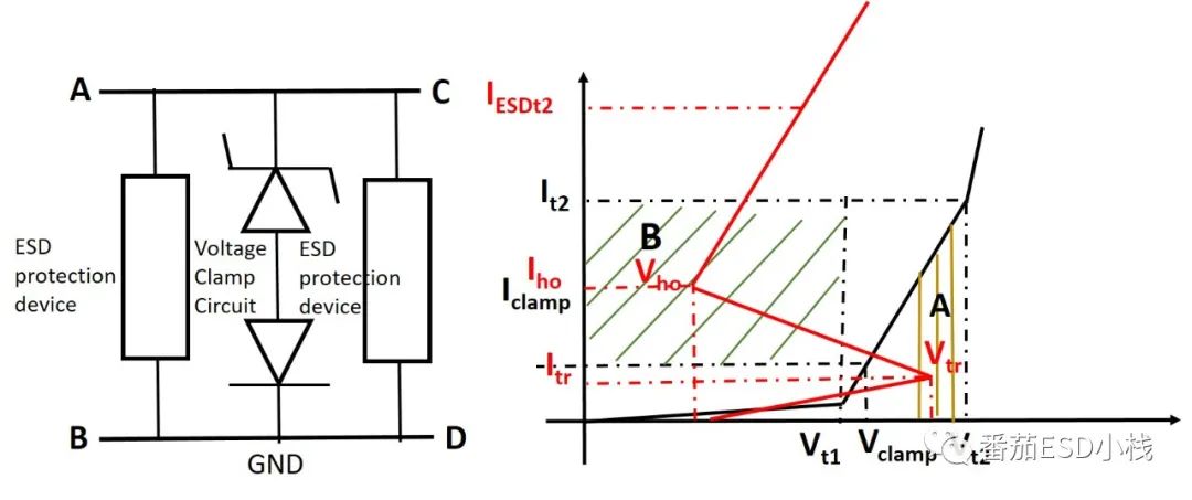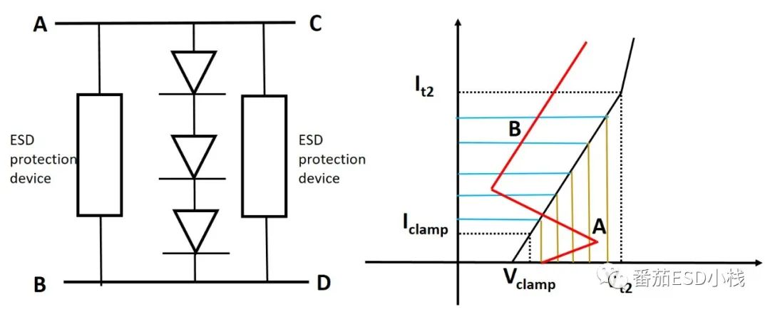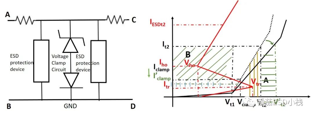 图四.电压钳位电路与ESD防护器件工作示意图。