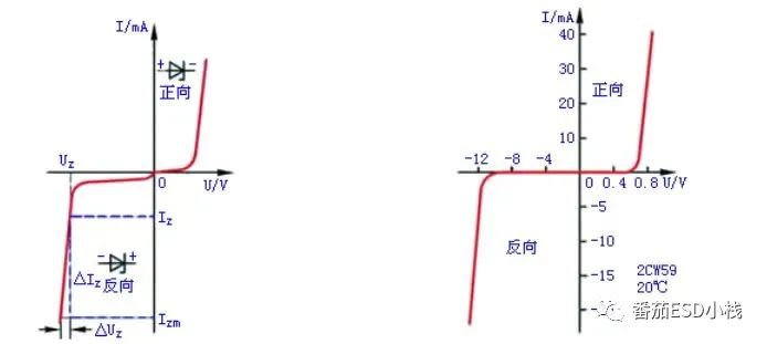 图四.齐纳二极管+正偏二极管钳位电路与ESD防护电路示意图与IV曲线。