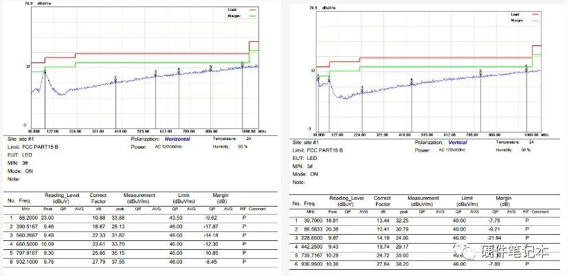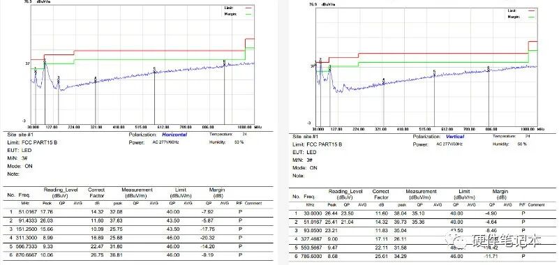 结果:水平测试,余量逼近限度线;垂直测试,31MHz、41MHz、53MHz处辐射数据超标5-10db;