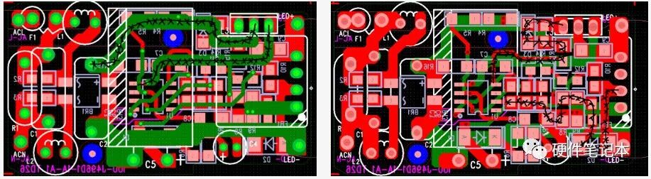 原有布线方案中,留意高频开关部分(打“X”的黑线),发现高频走线过长,环路面积太大: