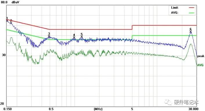 1、短接L2,L1=4.7mH,C1=0.1uf,C2=0.1uf,120V电压输入,L线传导图像: