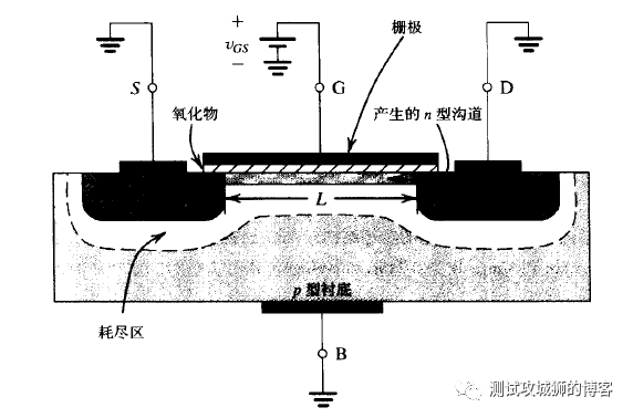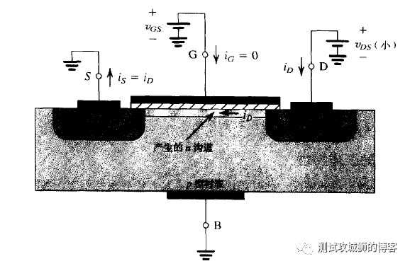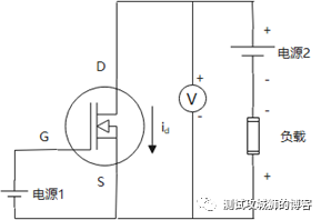 测试步骤:测试方法参考下图,使用直流电源1给G-S端供电,设置VGS电压。在D-S端串入直流电源2和负载,设置负载恒流模式和负载拉载值id,设置电源2电压。同时使用万用表测试D-S端电压。