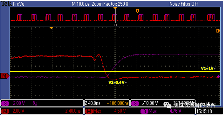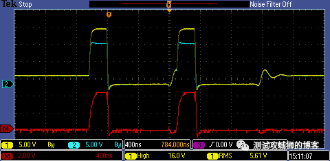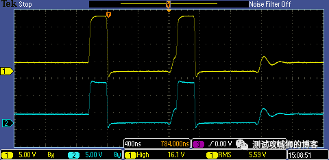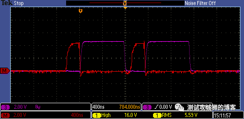 ① 我们先看一下ch1和ch2的波形:ch1为高边MOS的G端,ch2为高边MOS的S端,只有当VG-VS≥Vth时,高边MOS才会导通。